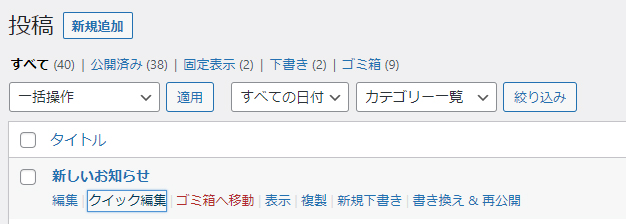 記事一覧画面の「クイック編集」から、記事の非公開設定が出来ます。また、ここからはタイトルや公開日の設定、カテゴリーの変更など、記事本文の修正以外の簡単な設定をすることもできます。