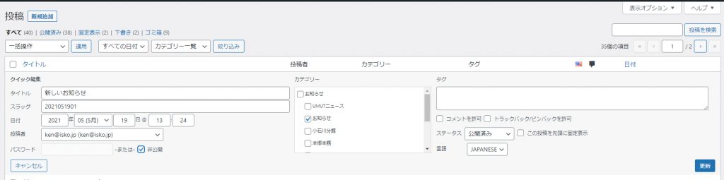 左側メニューの「投稿」から、記事の一覧を表示し、記事のタイトルをクリックすることで記事を編集することができます。公開の際と手順は同じですが、公開する際のボタンは「公開」ではなく「更新」と表示されます。