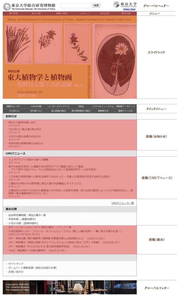 トップページは右のような構成になっており、各パーツによって編集方法が違います。
