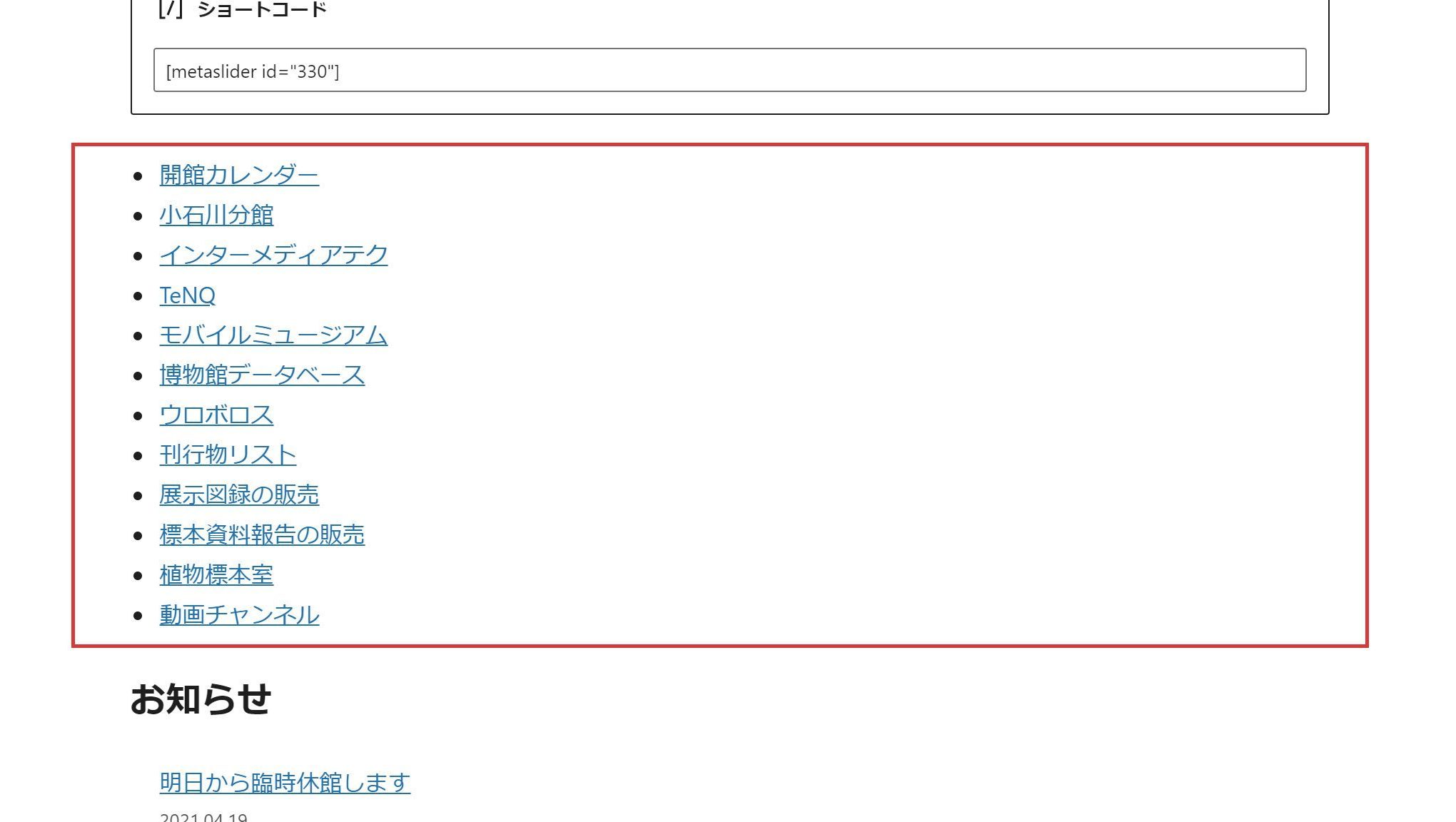 ニュース欄を編集する場合は、新着リスト(投稿の一覧)に注意しながら、既存のリスト項目のみを更新してください。お知らせ以下はグループ化されており、これが崩れると復旧が困難になる恐れがあります。見出しおよびリストの順序を崩さないように更新してください。ご不明な点は管理者にご相談ください。