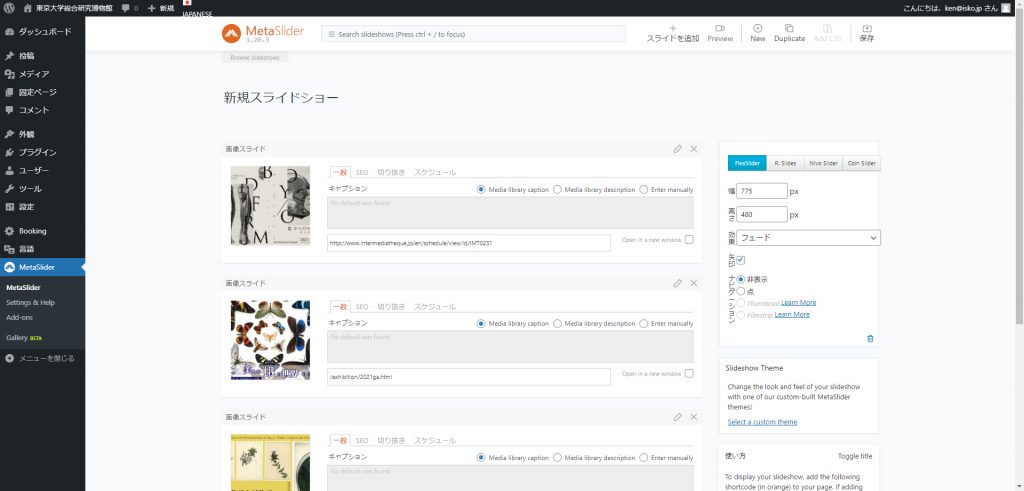 スライドショウを変更する際は、右側メニューの「MetaSlider」から行います。